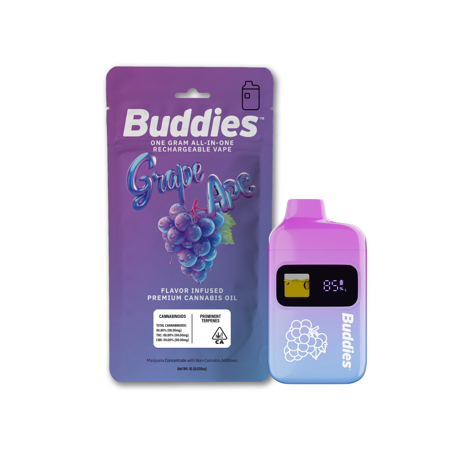 BBRAND 1G ALL-IN-ONE With Buddies BBrand 1g All-In-One vapes, there’s nothing to forget and everything to enjoy. Providing all you’ll need for a gram’s worth of pleasurable puffs, our all-in-one vapes match reliable, discrete hardware with a formula that’s rich in premium cannabis oil and impeccably flavored with a refreshing variety of natural plant-based terpenes. From Grape Ape to Raspberry Parfait, Buddies BBrand All-In-Ones pair fantastic flavors with maximum convenience for a product your pocket won’t want to be without. Ingredients: Cannabis oil, botanical terpenes