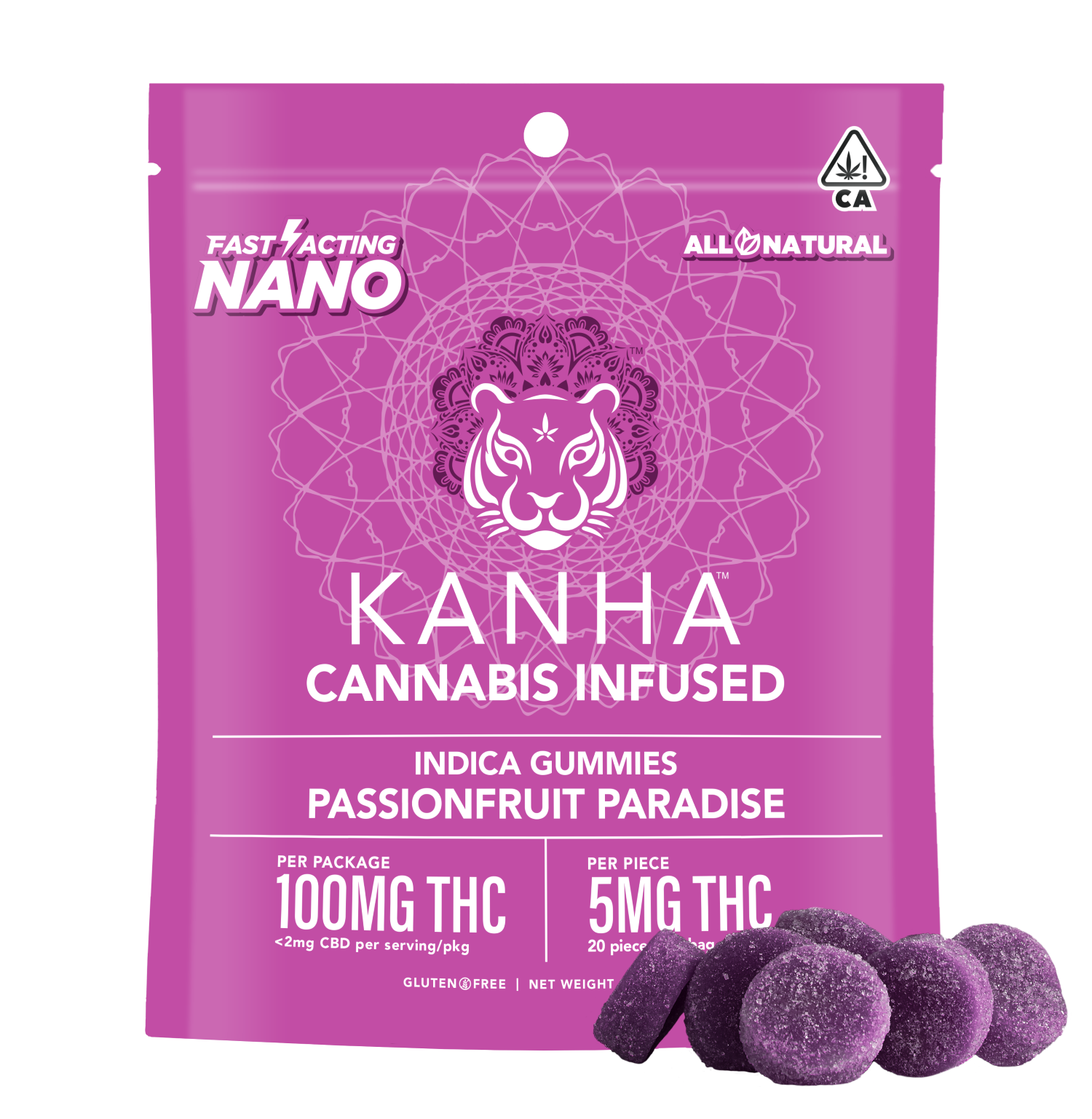 An exotic South American gem, passion fruit tastes like a refreshing wave of tropical goodness. Pairing the tangy citrus flavor with premium indica oil and terpenes like myrcene and α-humulene, Passionfruit Paradise Indica offers better absorption and faster onset times thanks to our exclusive NANO technology. Sold in packages of 20, each gummy contains 5mg of THC, an ideal amount for microdosing or customizing your experience. KANHA, the first to introduce fast-acting effects, remains the industry leader with NANO gummies.