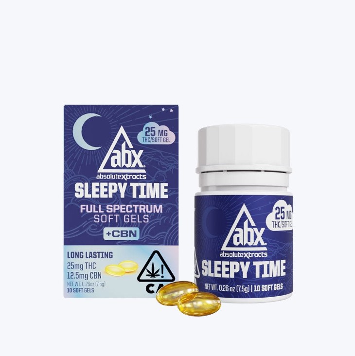 25mg/THC per capsule. ABX Sleepy Time is formulated with potent THC and a supporting blend of terpenes in an easy-to-consume, precisely-dosed gel capsule, designed to promote restful slumber. Premium distillate cannabis oil and high-quality coconut oil (MCT) aid absorption of the cannabis oil for optimal benefits.