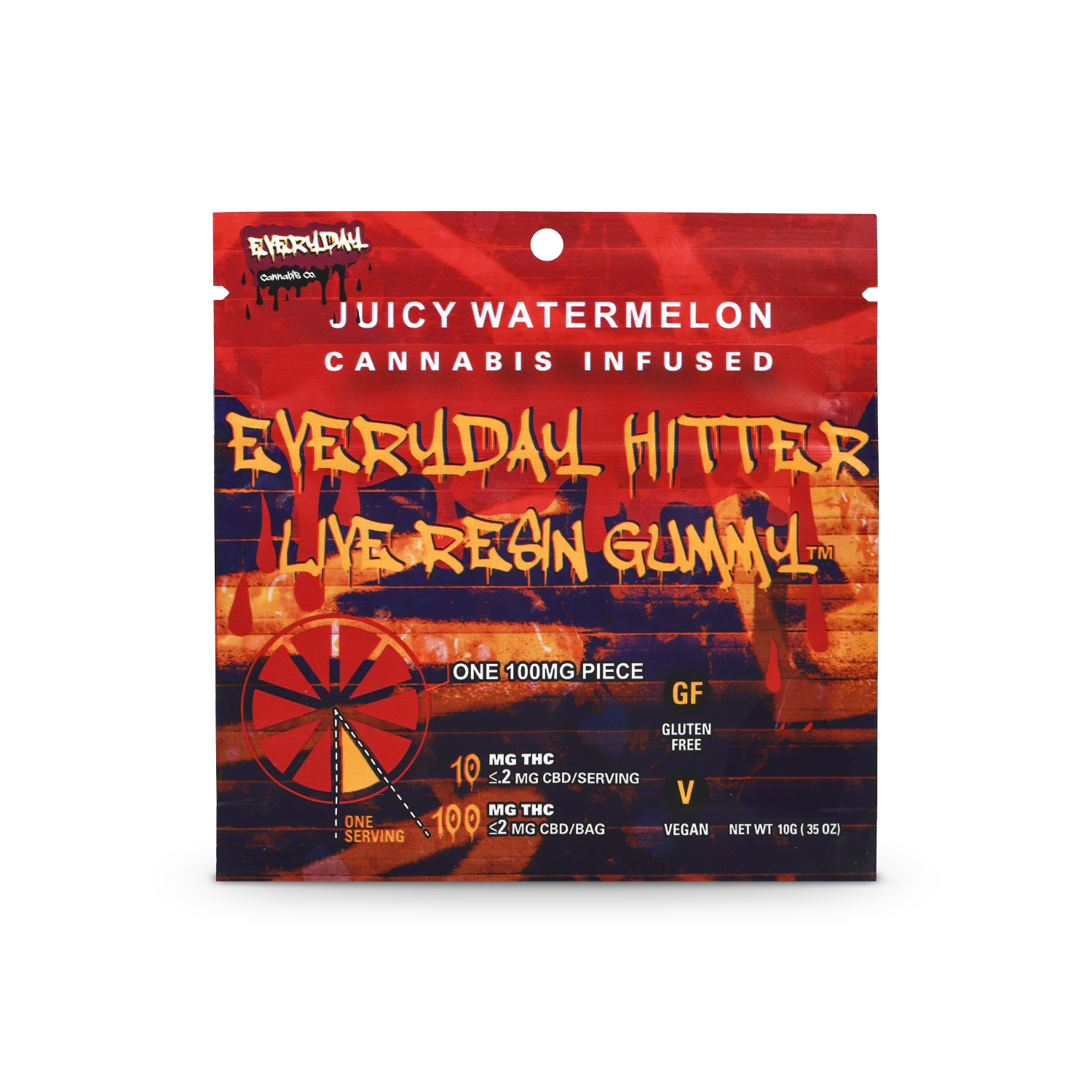 Everyday Hitters are a multi-dose 100 milligram single gummy specially curated with medical and high tolerance consumers in mind. Each gummy is vegan, gluten free, infused with full spectrum live resin sauce and are meant to be cut into ten pieces or taken all at once!