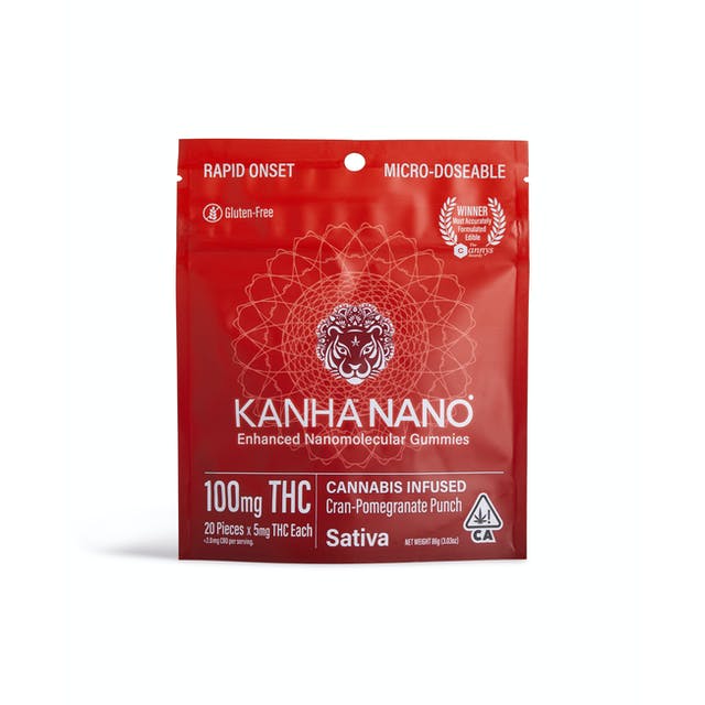 Kanha Nano utilizes nanomolecular technology to create the first fast-acting gummies in the industry. We take our award-winning, great-tasting gummies and infuse them with cannabinoid particles smaller than a wavelength of light, which increases the speed and amount that enters into your bloodstream. Our Cran-Pomegranate Punch gummies are tart yet sweet and made with sativa terpenes, which induce a stimulating and uplifting state of mind. And with only 5mg of THC per gummy and an average of 10-20 minutes for onset, these are the perfect gummy for micro-dosing.