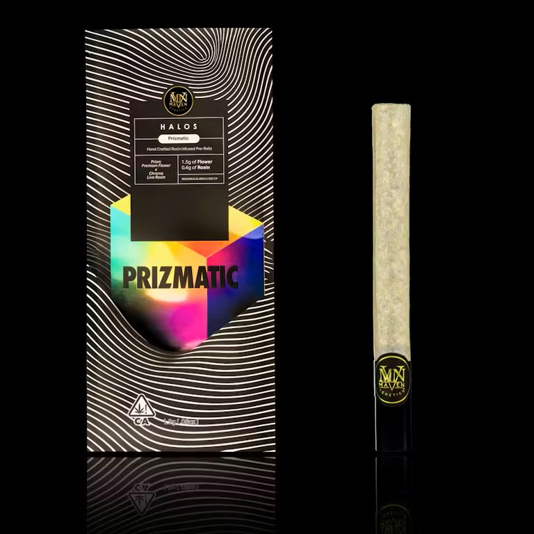 Prizmatic radiates depth and dimension — a harmony of two bold, Indica-dominant cultivars that exemplify Maven’s artistry. This fusion of Prizm’s lemon-diesel brilliance and Chroma’s velvety fruit-and-fuel rosin creates a smooth, slow-burning experience that unfolds in vivid layers. Bright top notes of citrus and pine give way to undertones of floral musk and dark fruit, finishing with a clean, resinous exhale that grounds the senses. The effect is immersive and deeply soothing — a serene spectrum of color, calm, and clarity.