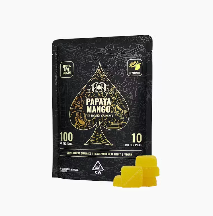 Our Papaya Mango gummies offer a delightful combination of tropical flavors in a cannabis-infused treat. Bringing together the luscious sweetness of papaya and the succulent tanginess of mango. As a hybrid edible, it combines the best of both indica and sativa effects, providing a balanced experience that relaxes the body while stimulating the mind. Each bite-sized piece delivers a tropical burst of fruity flavors, accompanied by a gentle, harmonious high. Enjoy the mouthwatering taste of this blissful, rosin-infused, indulgence.