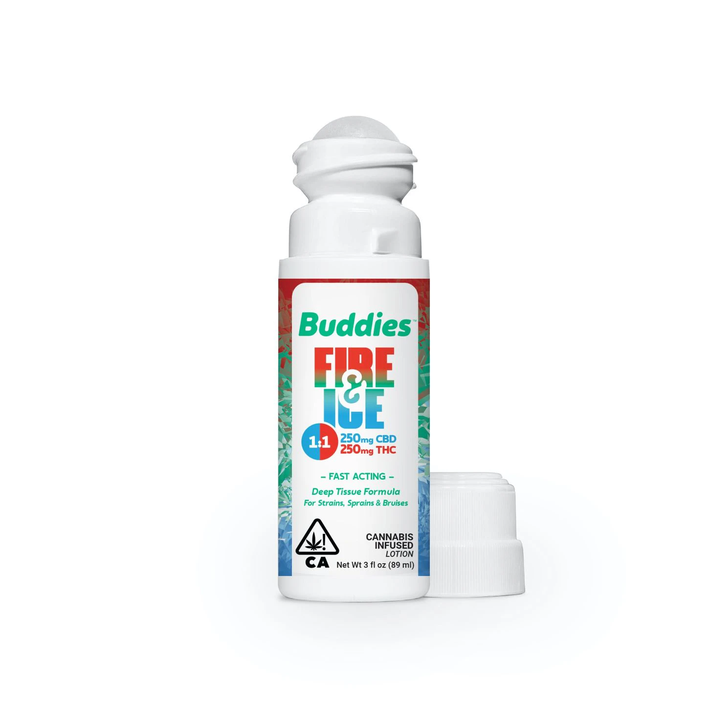 Buddies Fire & Ice Roll-On Topical. Buddies award winning Fire & Ice Topical. From athletes to grandmas, this 500mg THC topical does wonders for wellness. Fire & Ice is all natural, has therapeutic strength, and is long lasting. It is non-greasy, has an easy roller application, and is enhanced with organic essential oils.
